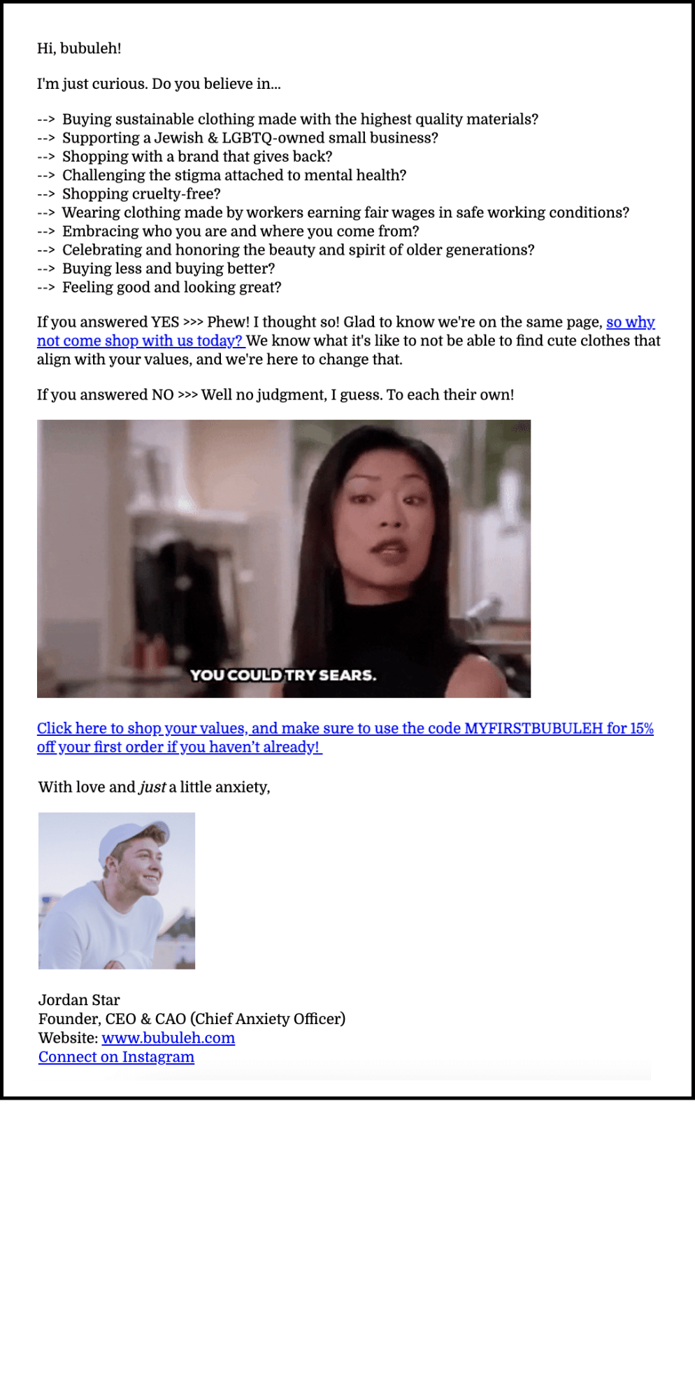 Though I can’t share most of these campaigns due to their proprietary nature, below I’ve shared a few campaigns from my clothing brand, bubuleh, that show some of the unique ways I approach email marketing.